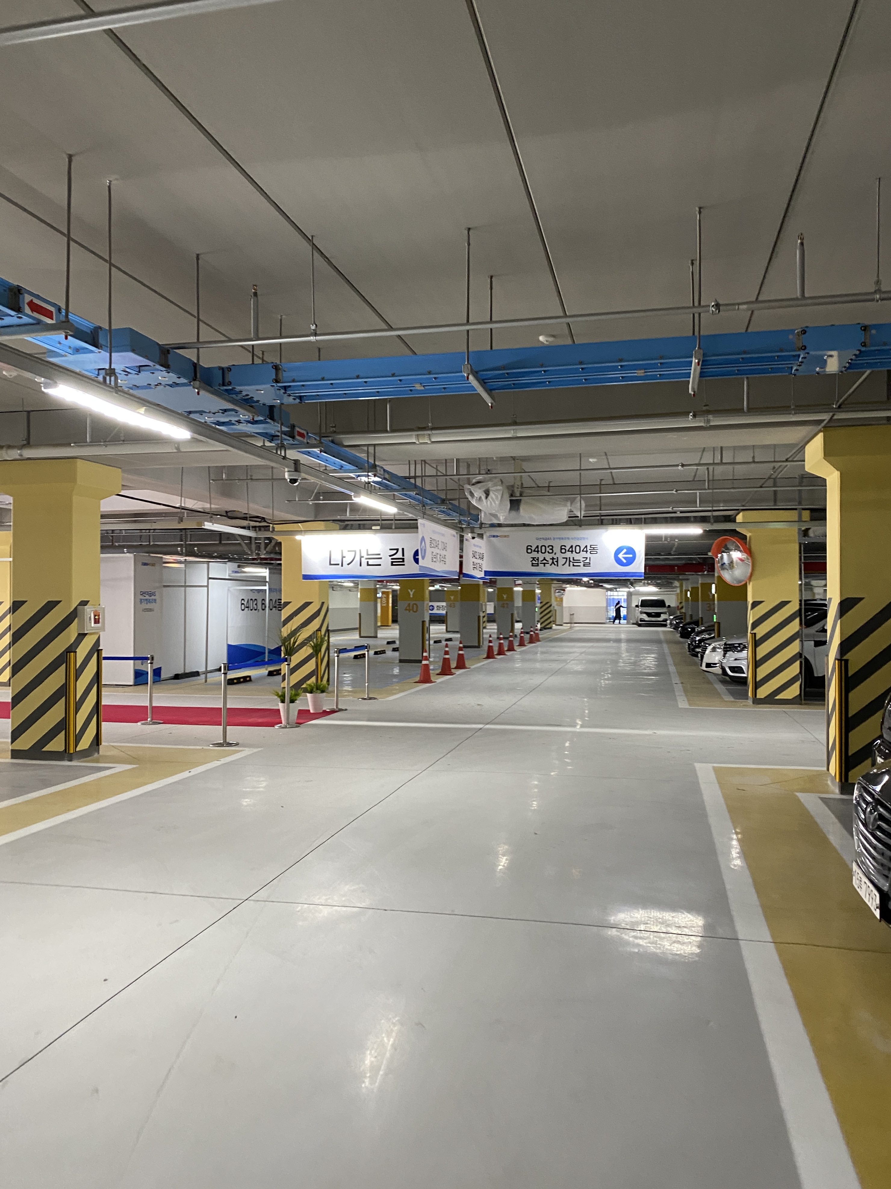 주차장으로 들어가기 전에 입구에서 발열체크를 한다.