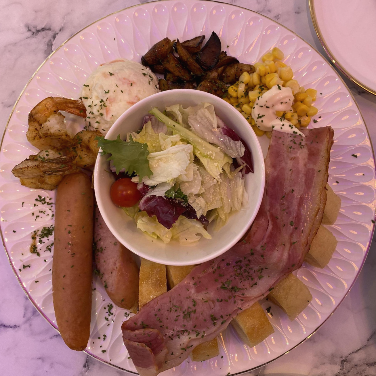 치아바타 빵, 베이컨, 소시지, 감자샐러드, 새우구이, 샐러드가 한번에 나오는 브런치 메뉴였어요.