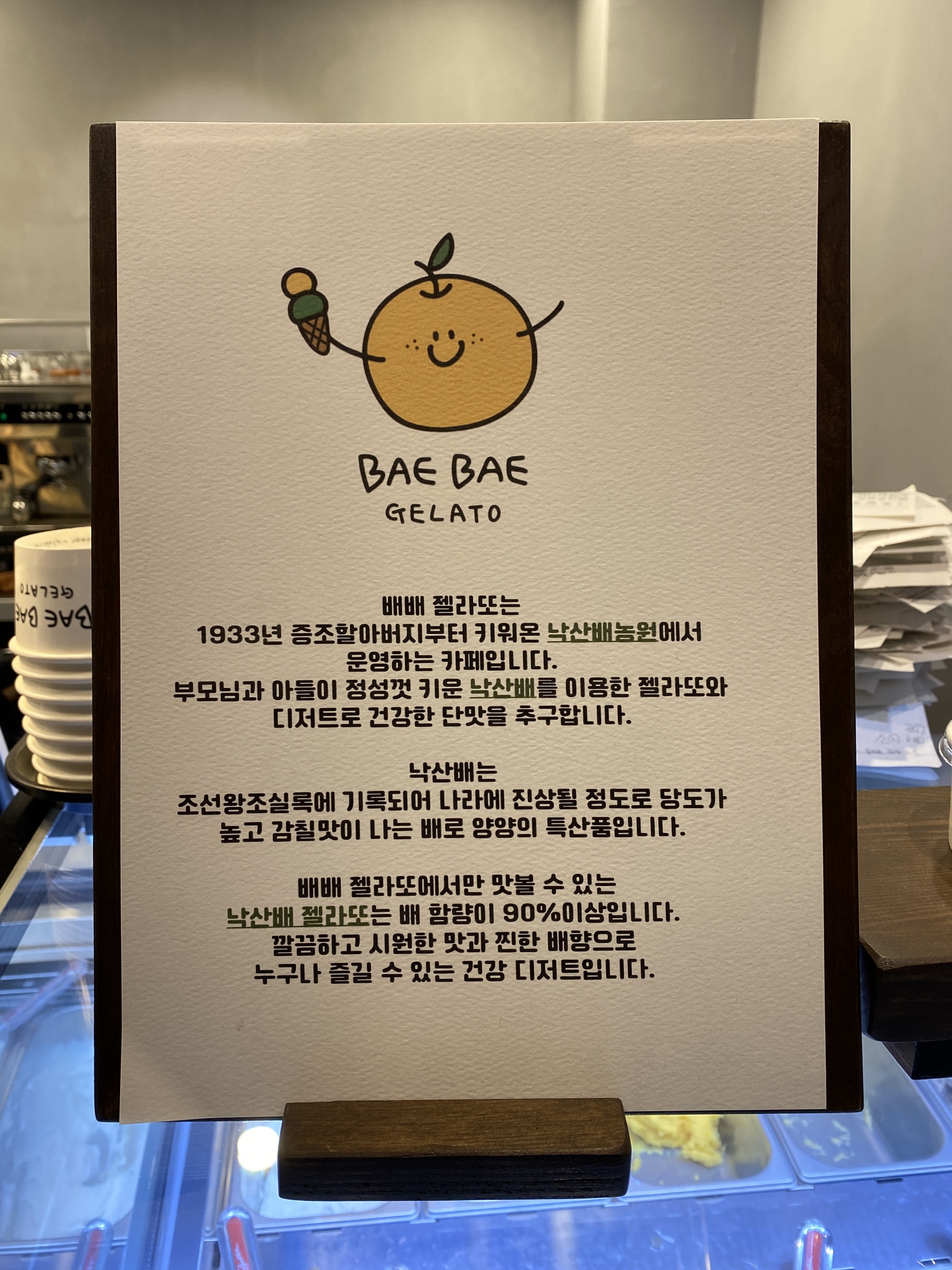 배배젤라또는 낙산배로 만든 배젤라또가 시그니처 메뉴입니다.