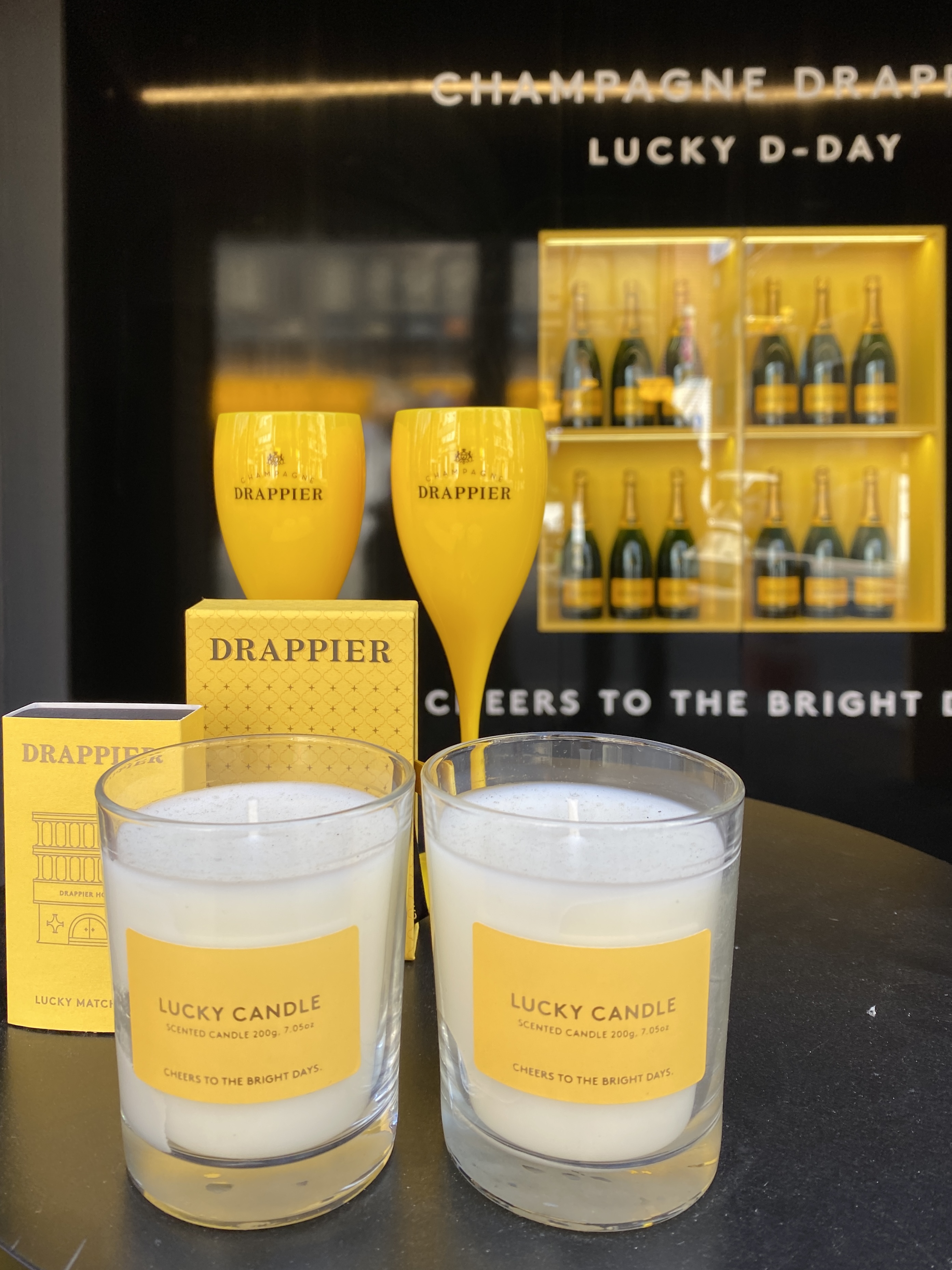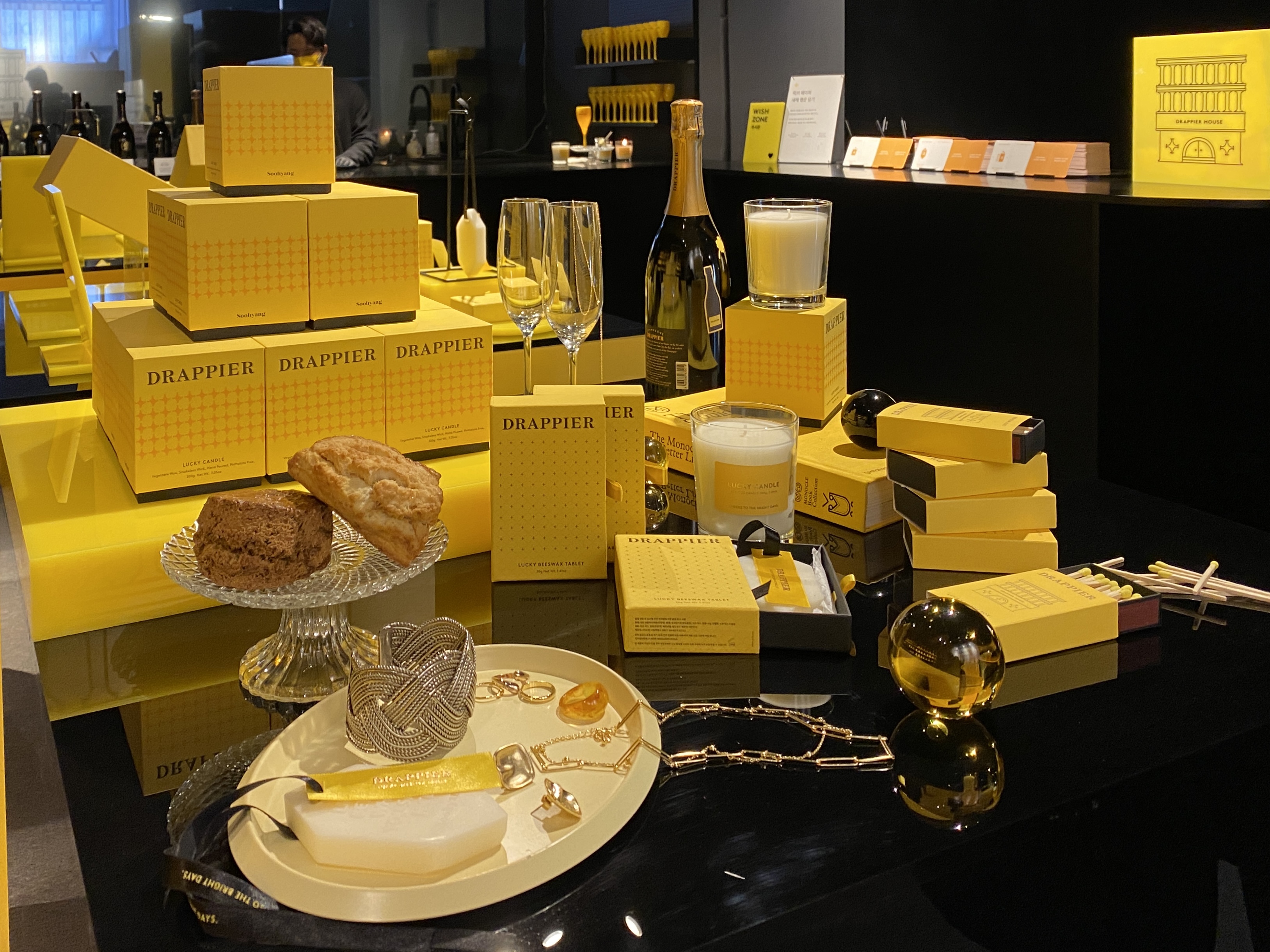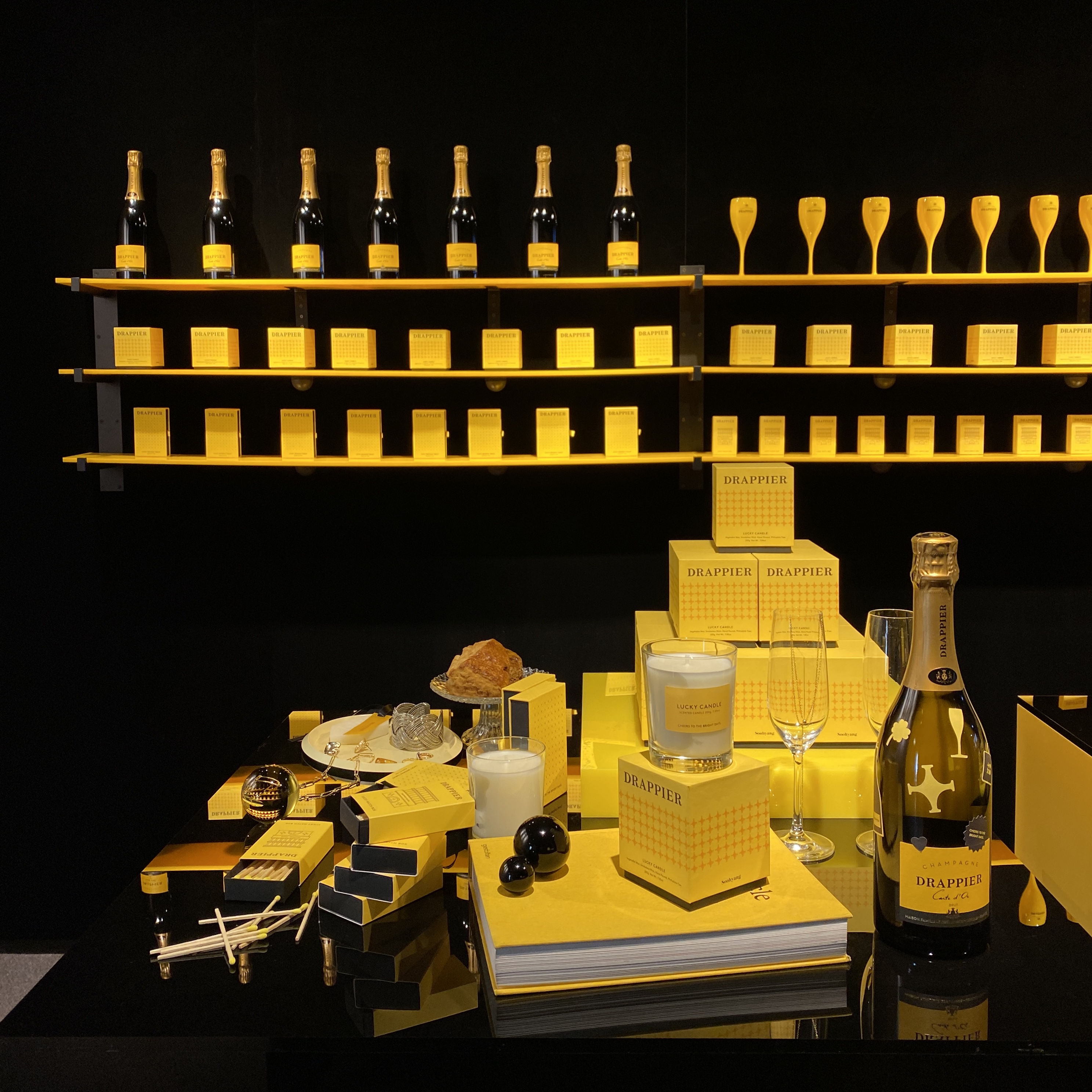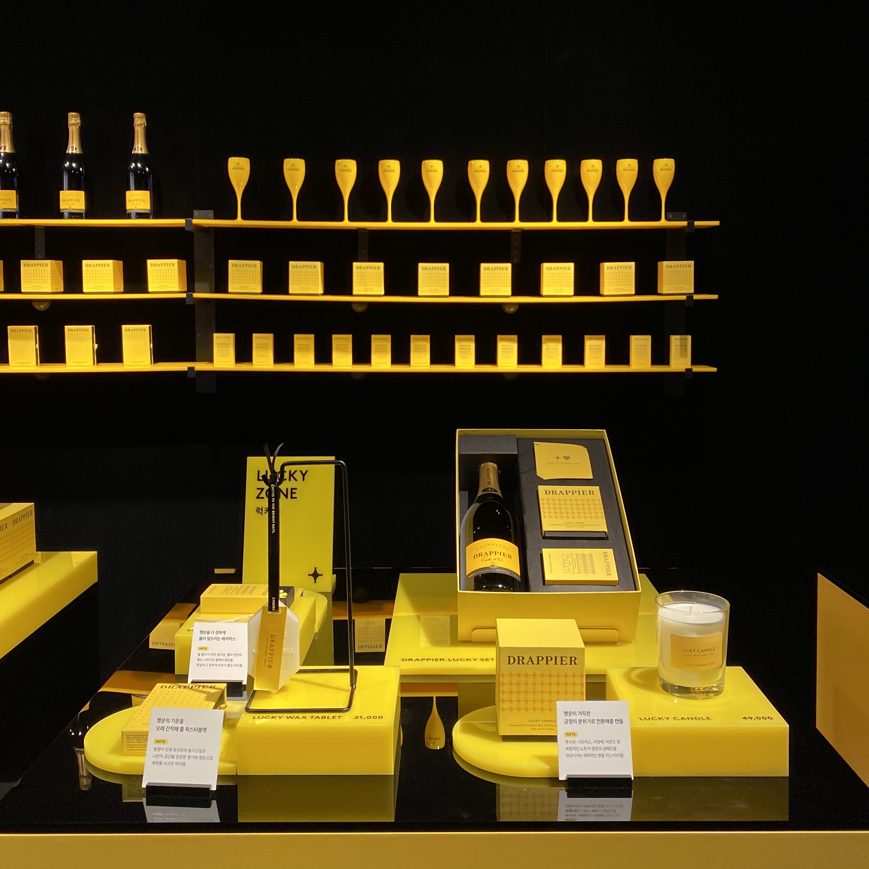 굿즈와 드라피에 샴페인을 전시해두었어요.
