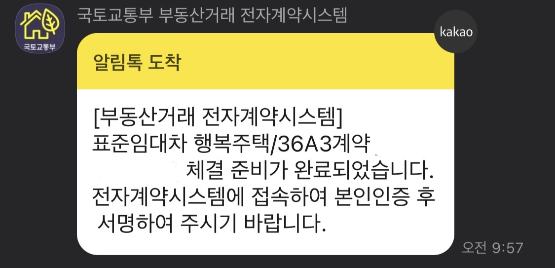 다산지금A5 경기 행복주택 36형 전자계약 하는 방법 드디어 카톡으로 행복주택 전자계약준비가 완료되었다는 메세지가 왔다. 카톡을 받고 점심시간이 되자마자 전자계약시스템에 들어갔다.