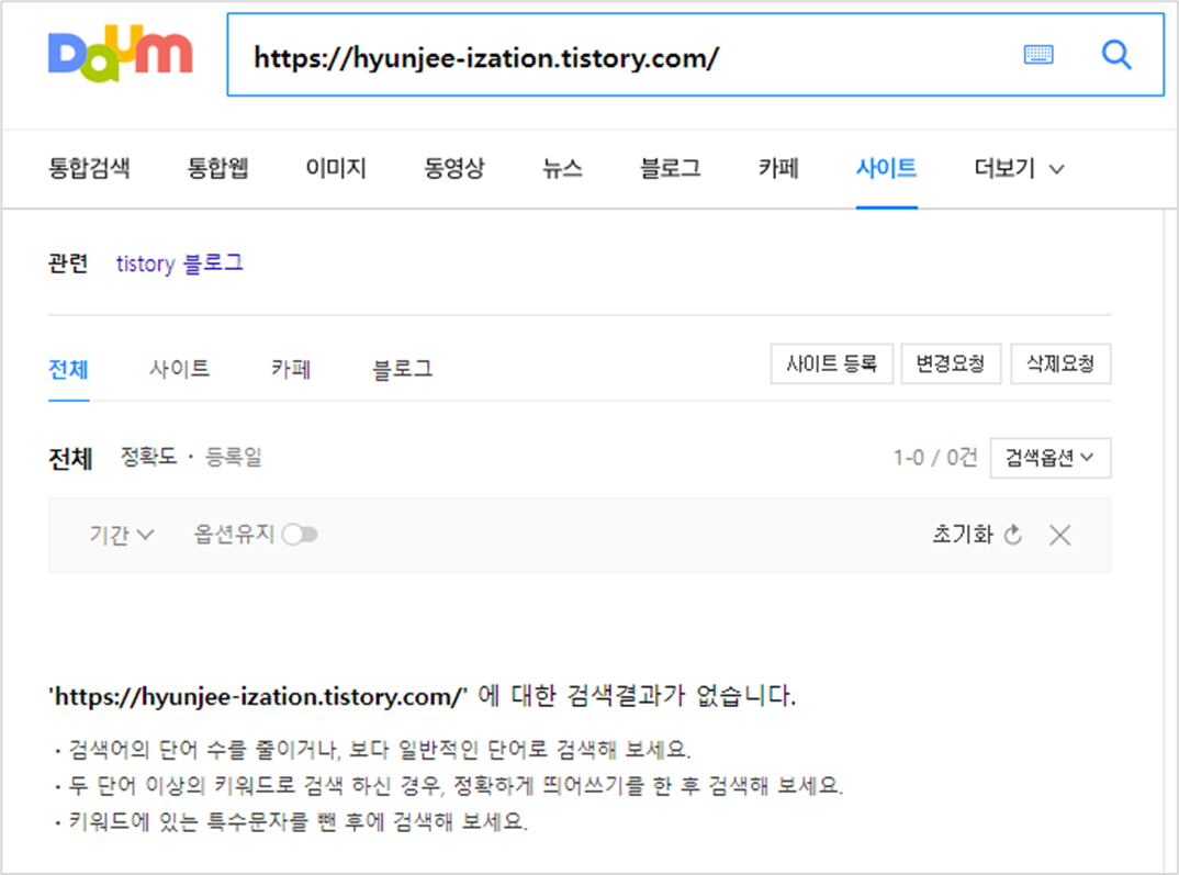 다음에 사이트 검색을 했을 때, 검색 결과가 없다고 나오면 저품질이 걸린거라고 합니다.