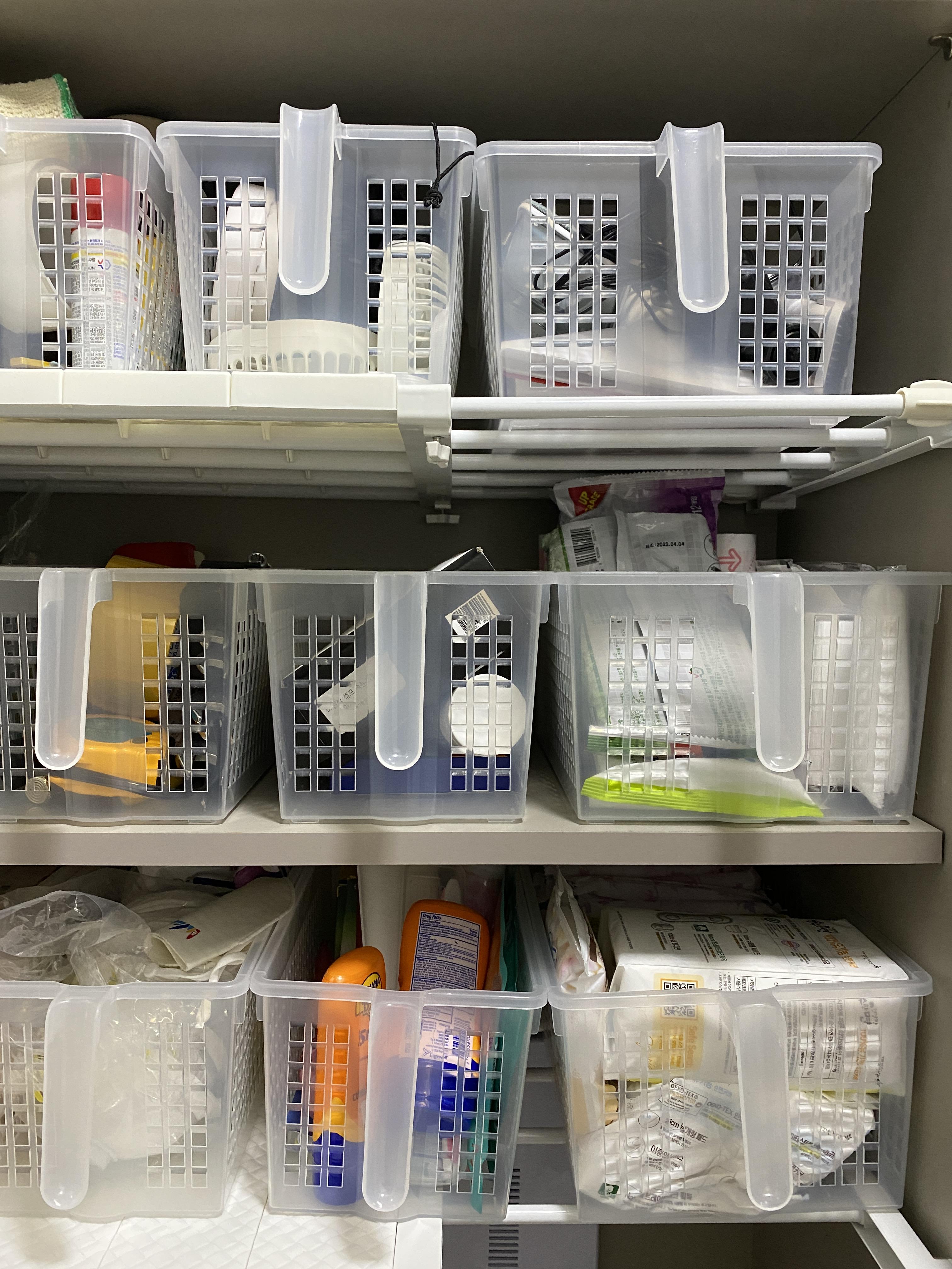 의도하진 않았는데, 다이소에서 산 투명 손잡이 바구니 3호 3개 + 4호 1개 가 행복주택 36형 팬트리 가로사이즈에 딱 맞았습니다.