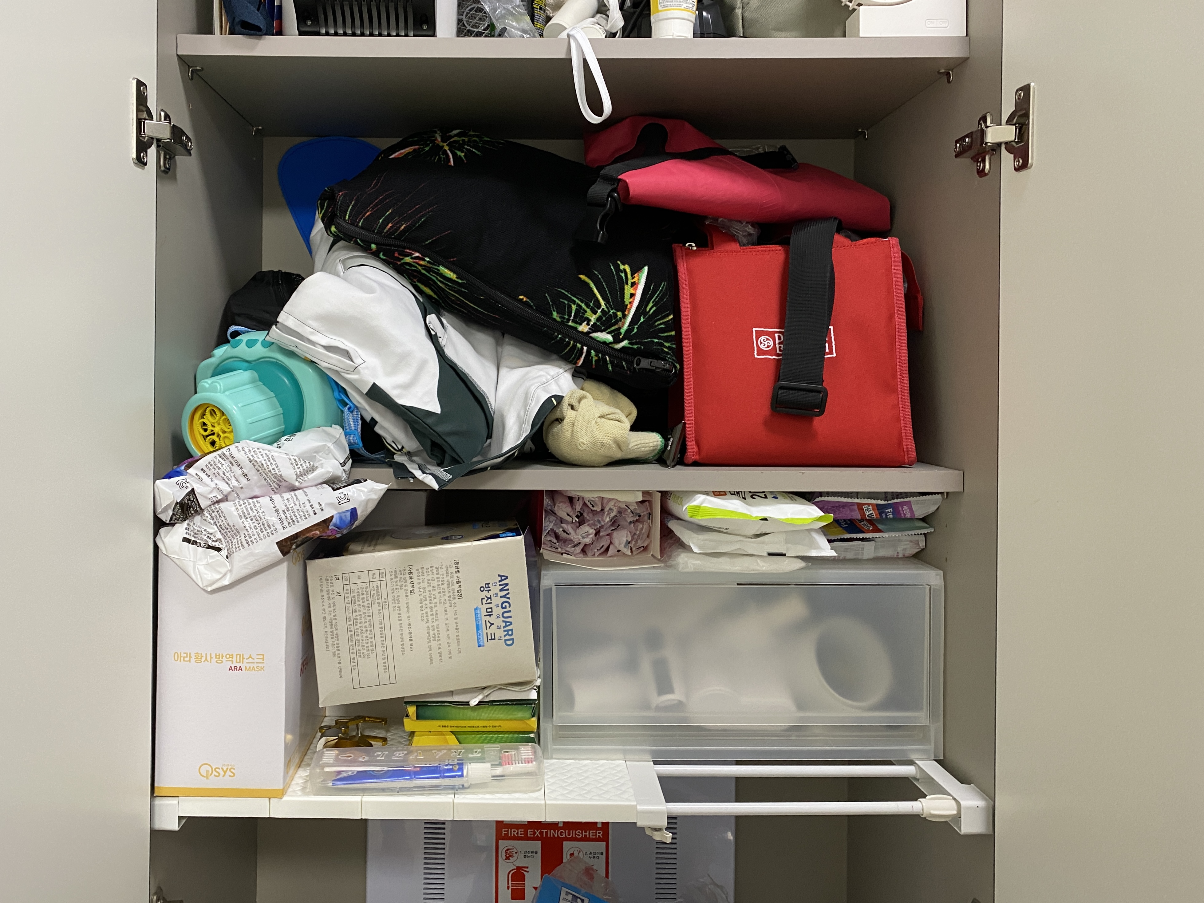 압축선반으로 분리를 하긴 했는데, 바구니나 수납함이 없어서 정리정돈은 안되더라구요.