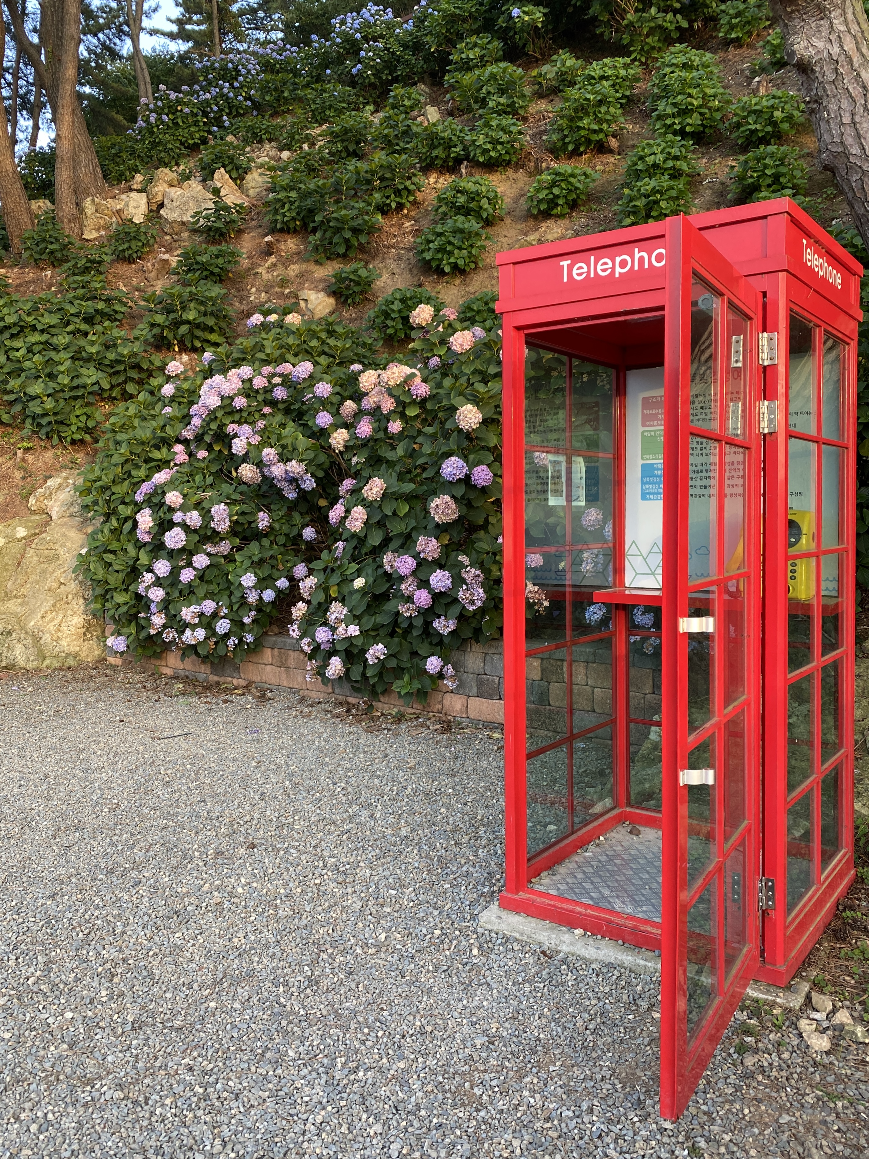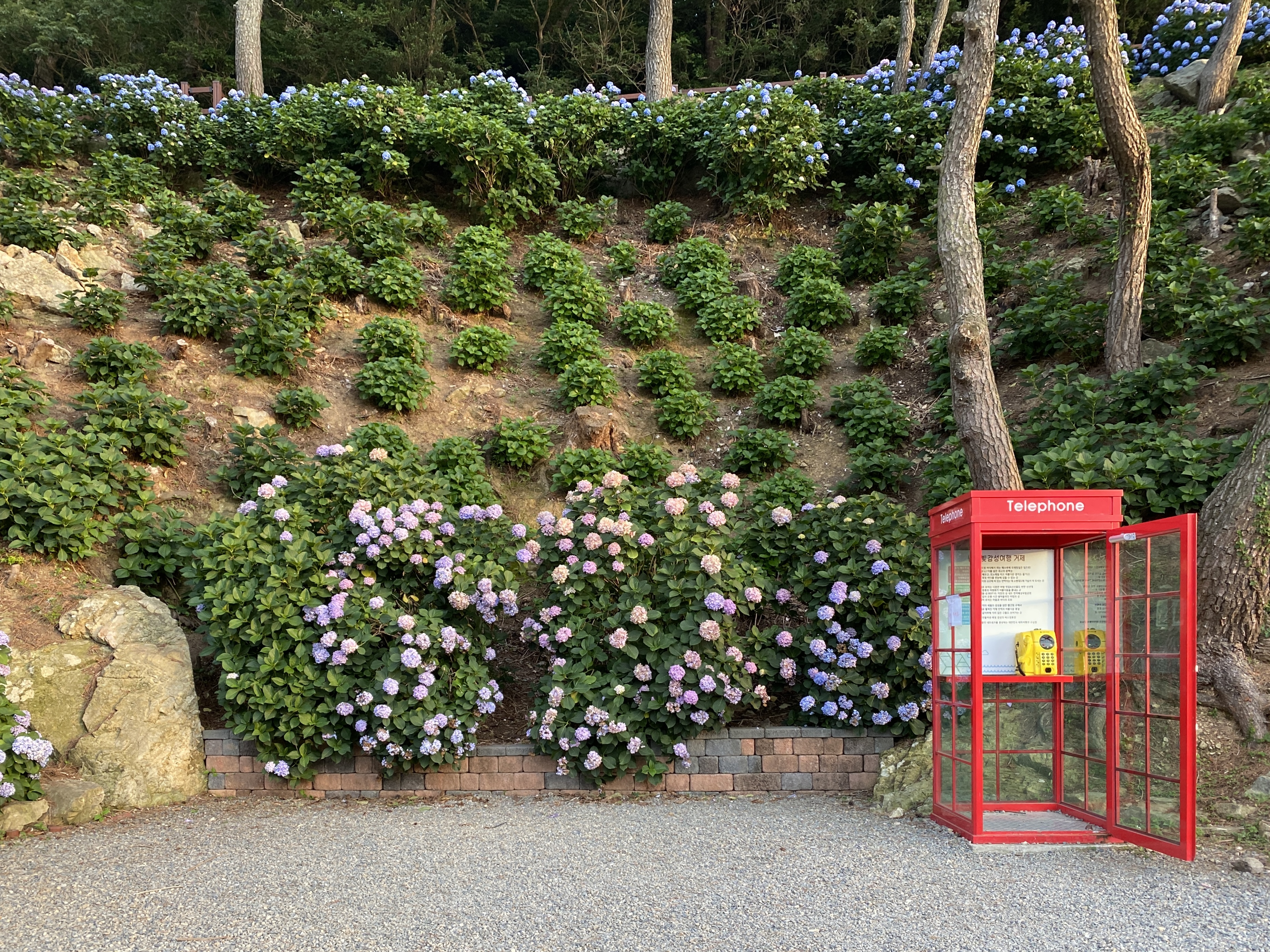 인스타그램에서 많이 보던 전화박스 포토스팟도 있습니다. 저도 이 장소에서 사진을 남기고 싶었는데, 이 날 삼각대를 깜빡한 것 있죠..? 수국 사이에 빨간 포토박스가 있어 사진이 잘 나올 것 같았어요.