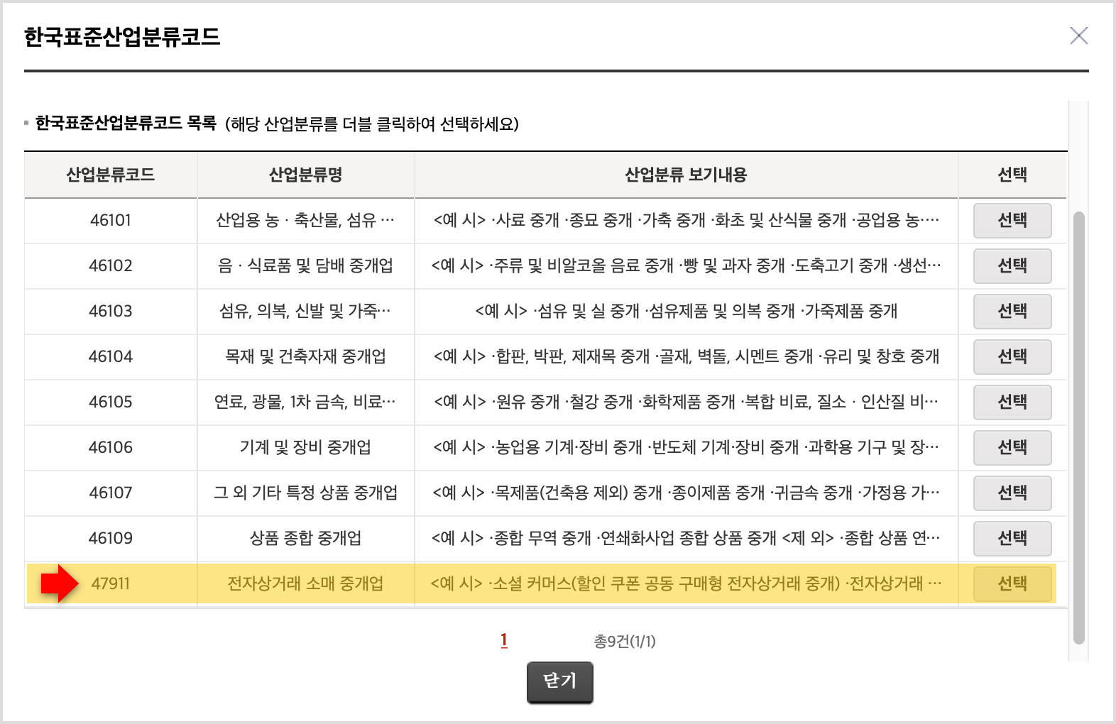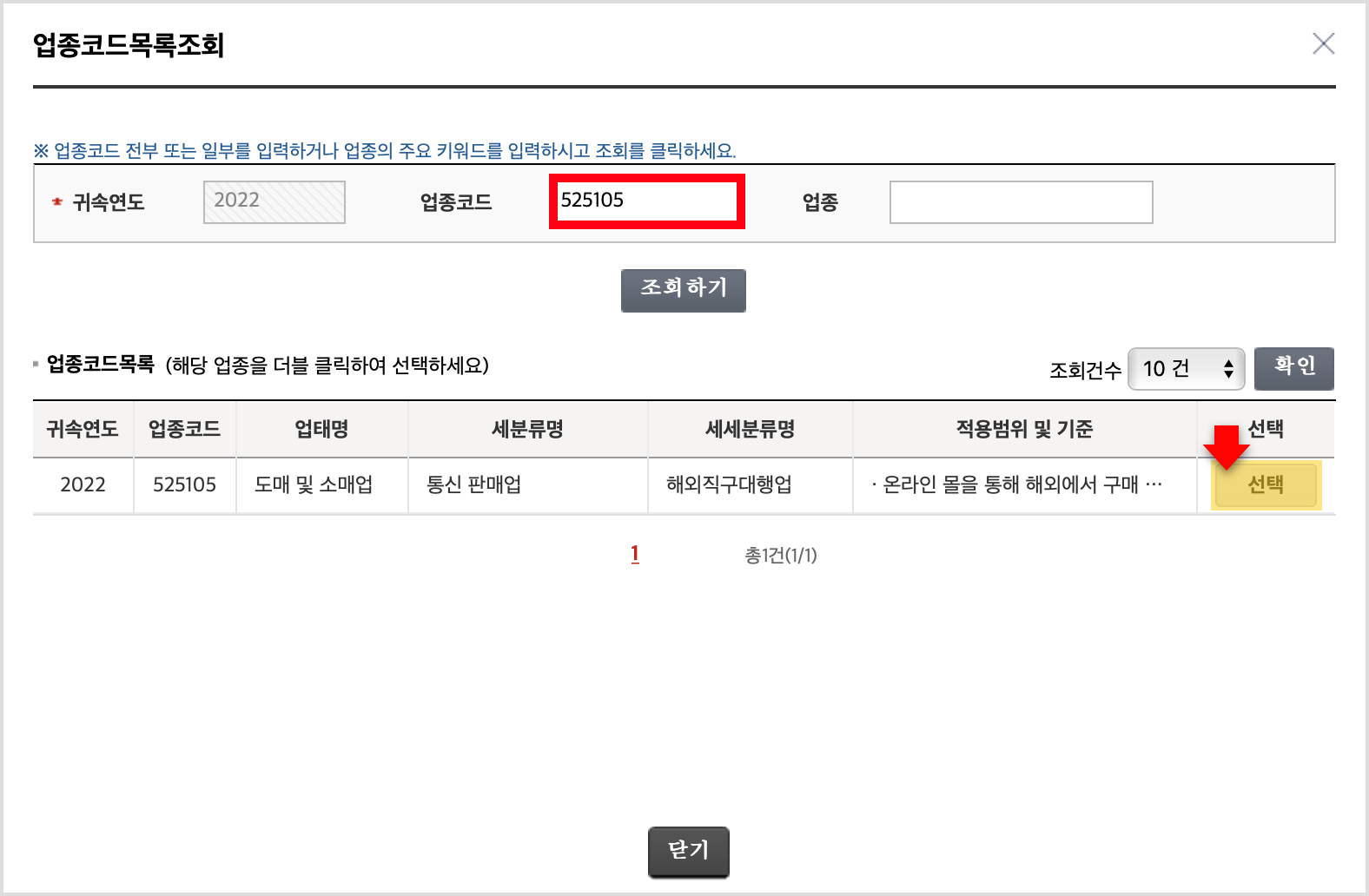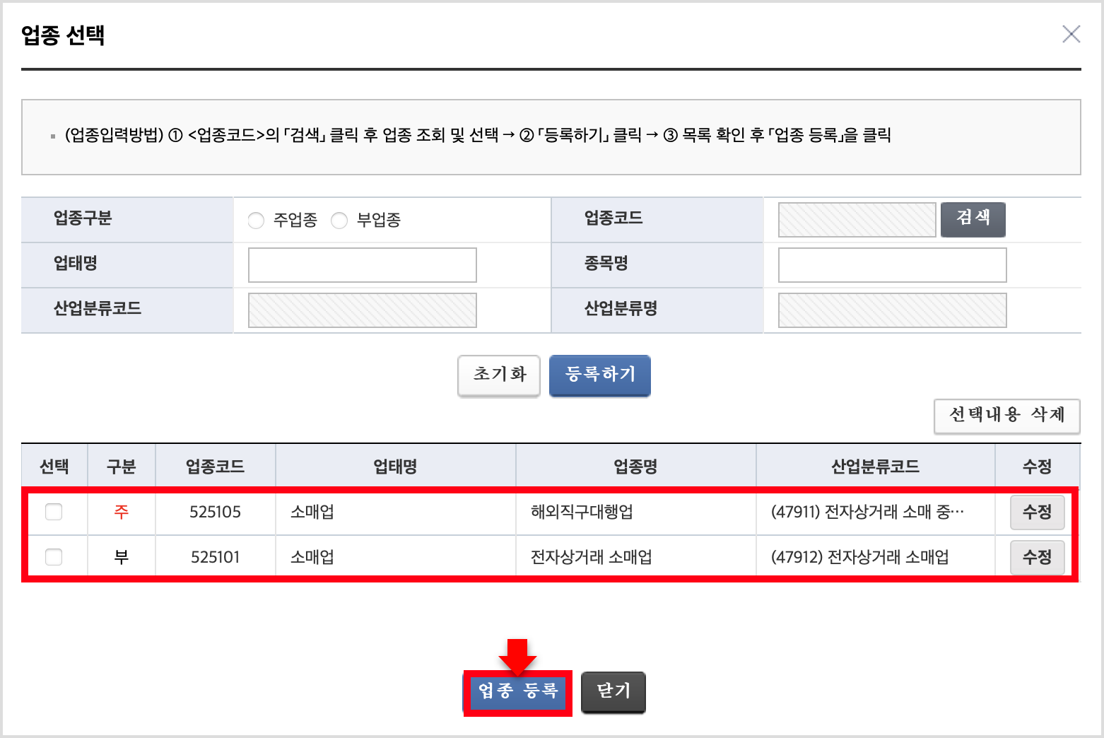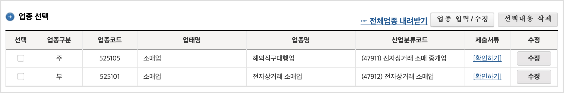 아래 이미지는 업종코드 등록하는 법을 순서대로 캡처한 이미지니, 등록하실 때 참고하시면 될 것 같습니다.