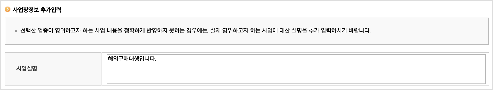 그리고 사업장정보 추가입력란에는 [해외구매대행] 혹은 [해외구매대행 입니다] 로 적어주었어요.