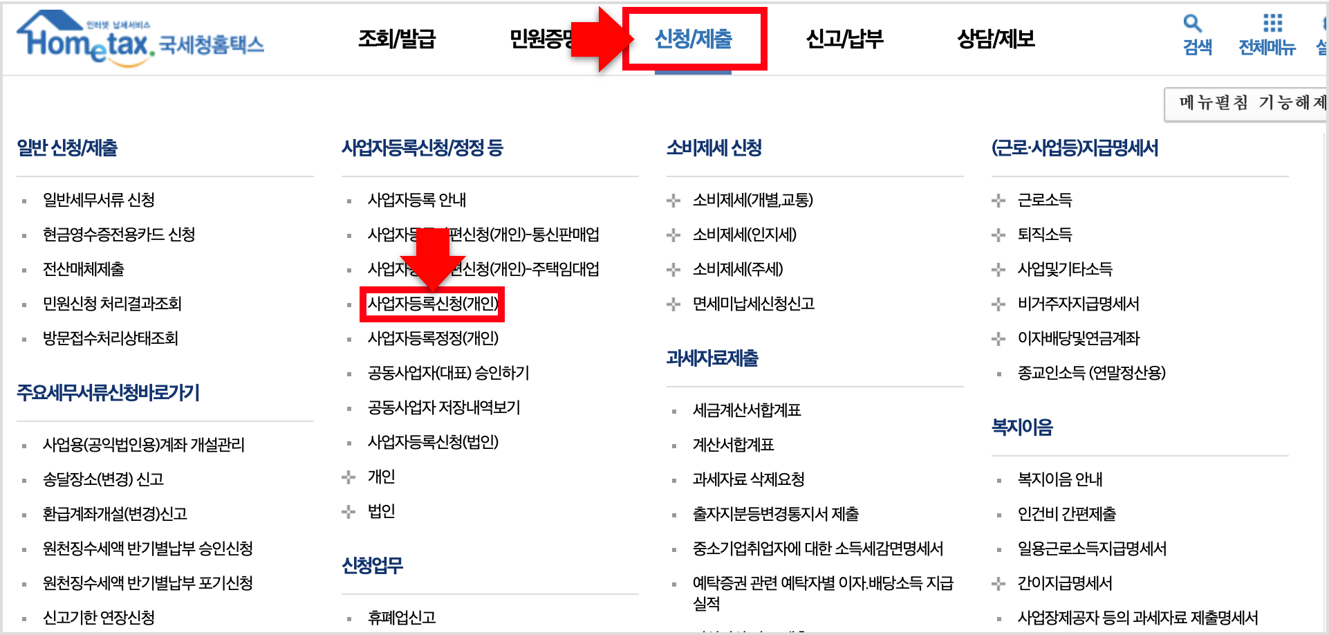 신청/제출에서 [사업자등록신청(개인)] 클릭을 해줍니다. 처음이라면 보완관련 프로그램 설치를 먼저 해야합니다.
