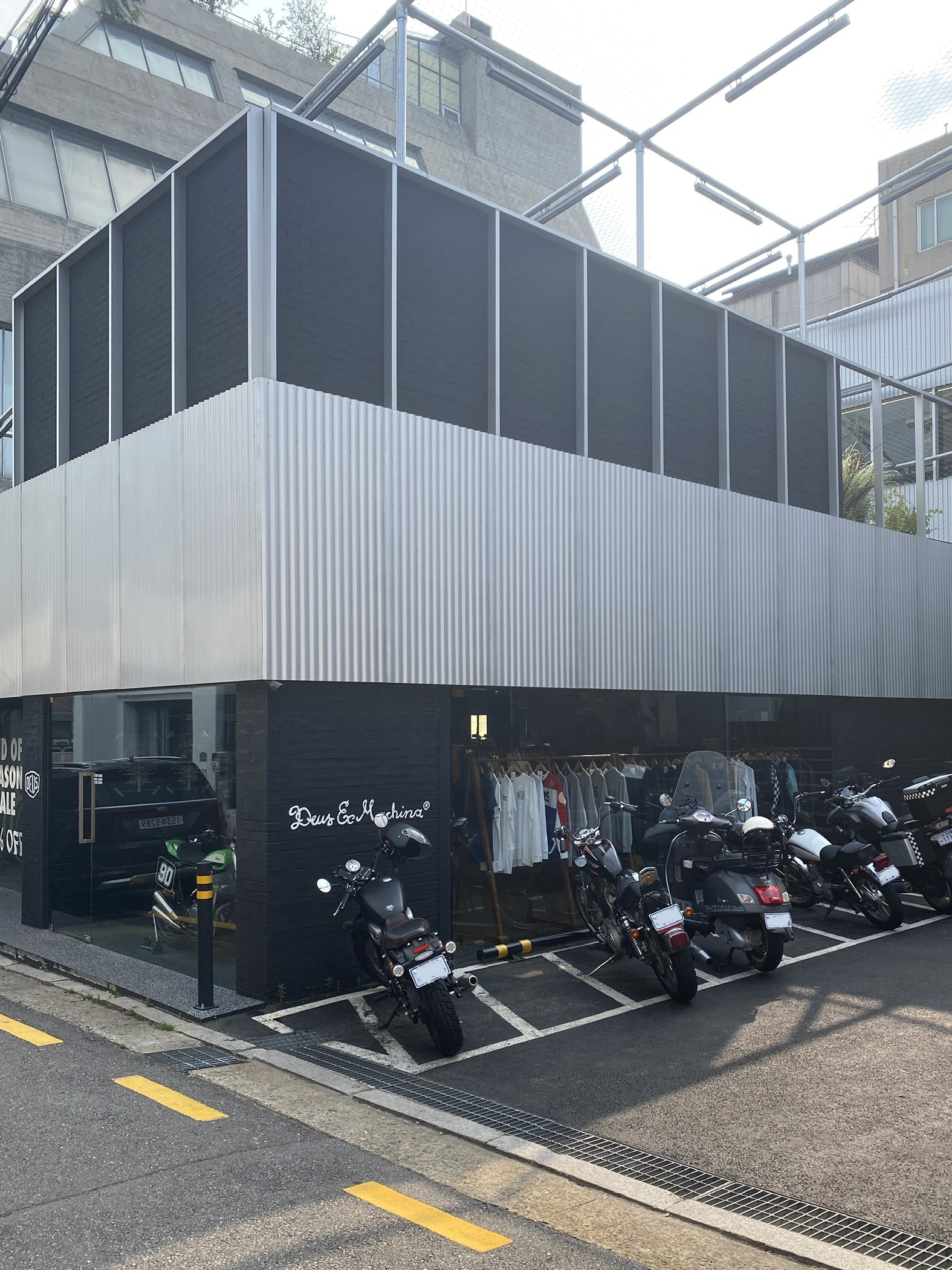 바이커들의 성지인 만큼 가게 앞에 오토바이 주차장이 귀엽게 있었어요.