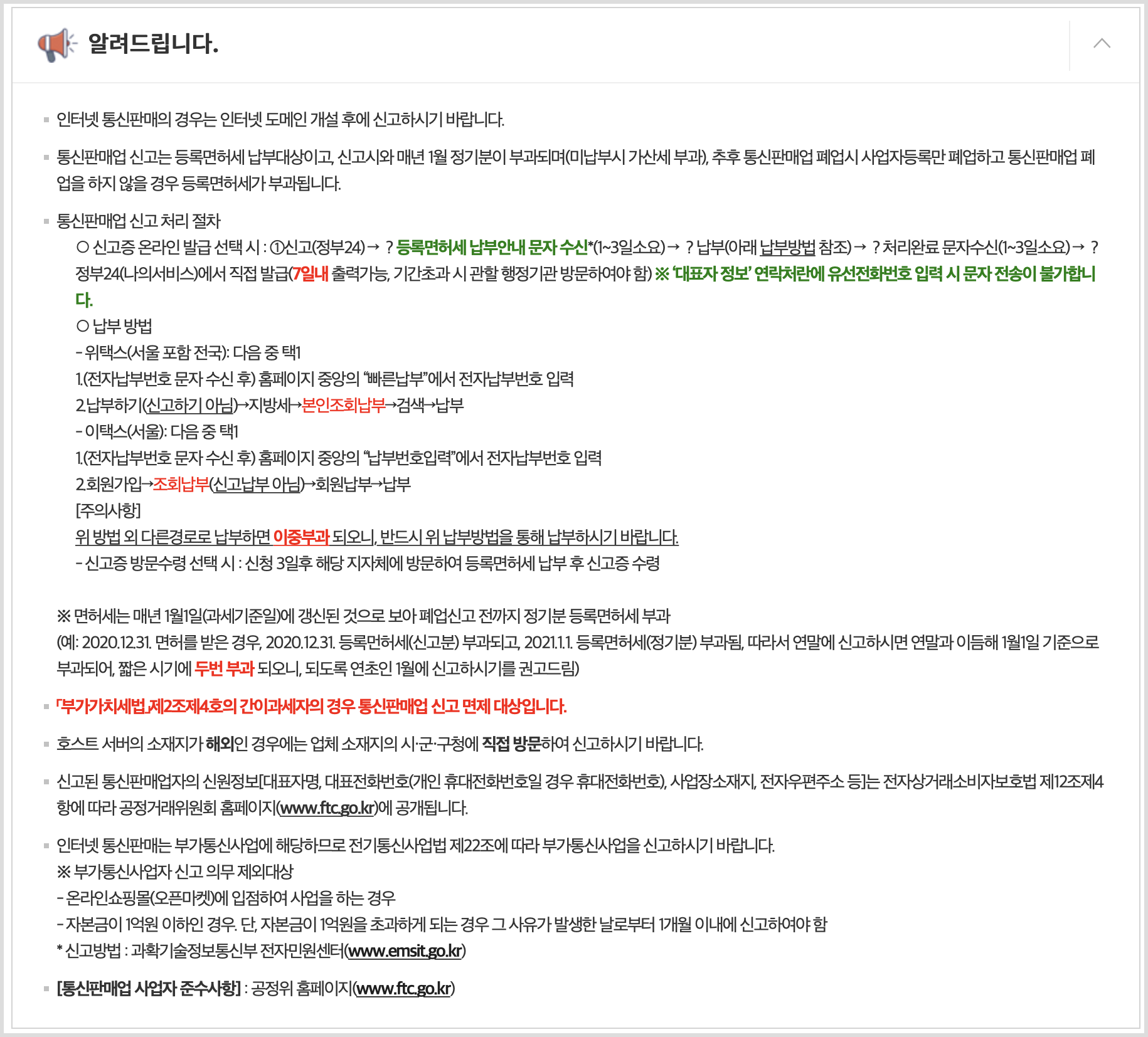 📢 정부24에서 통신판매업 신고할 때 아래와 같은 공지사항을 확인할 수 있습니다.