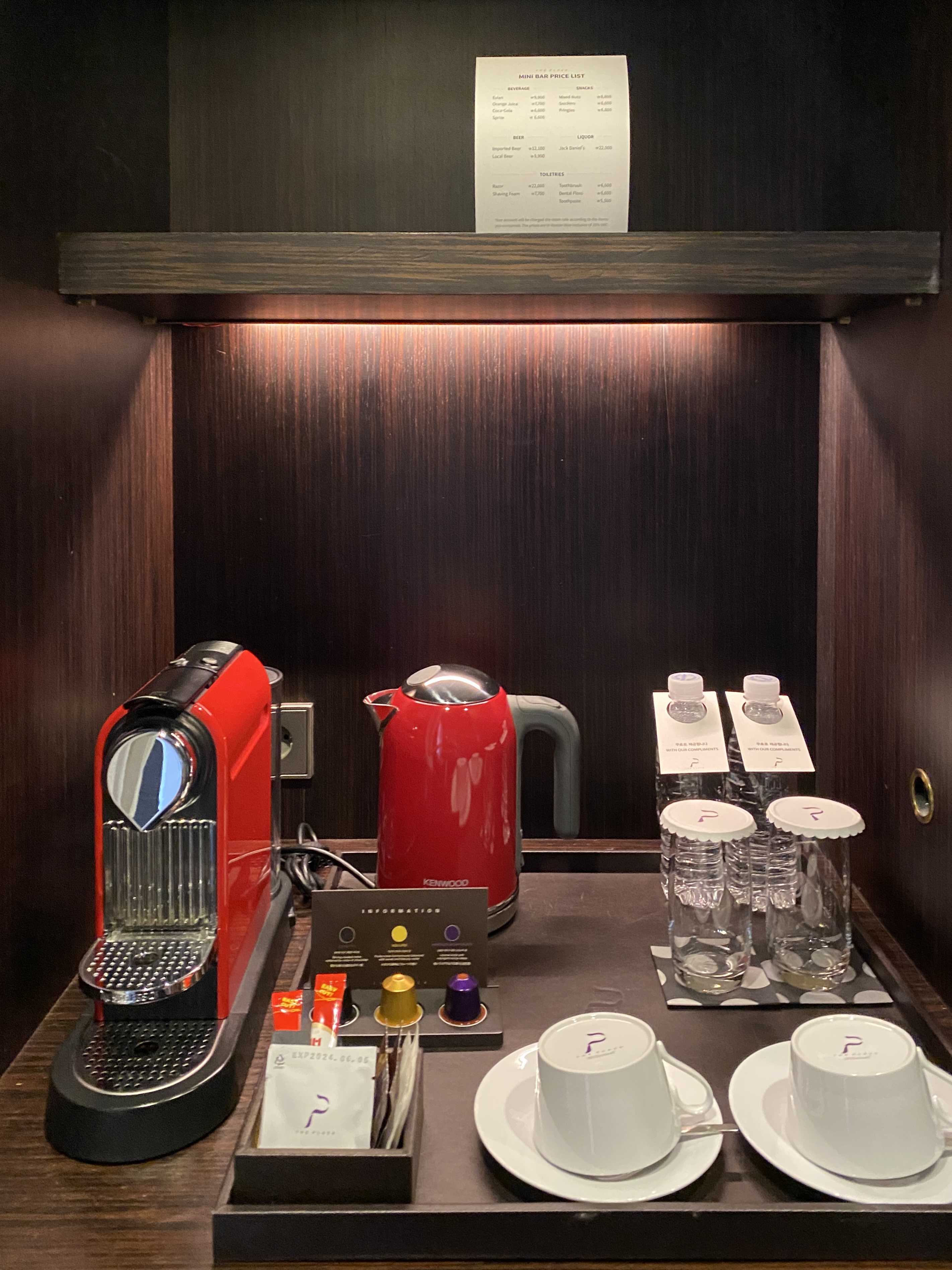 그리고 냉장고에서 물, 탄산수 등을 꺼내먹을 수 있고, 객실로 들고갈 순 없습니다.