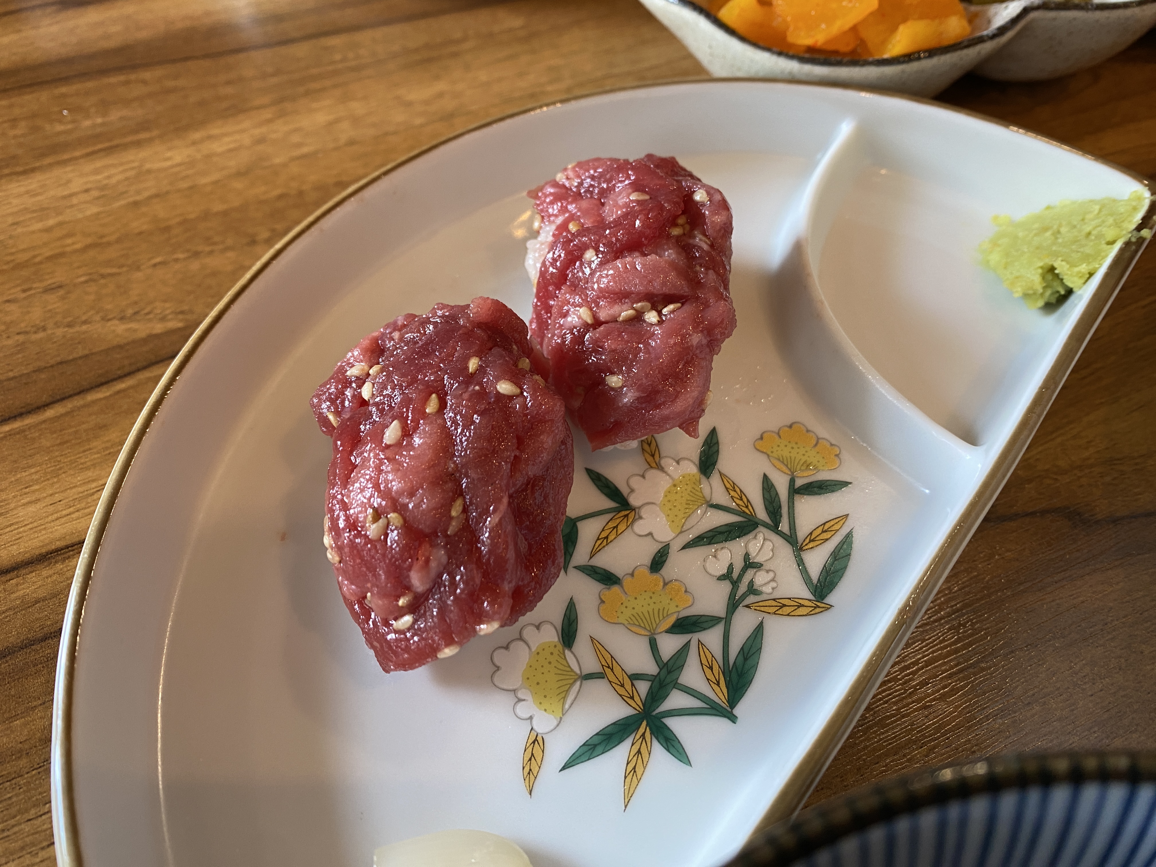 육회 초밥 2피스가 나오는 메뉴였는데요, 육회 너무 싱싱하고 찐으로 맛있었어요!!