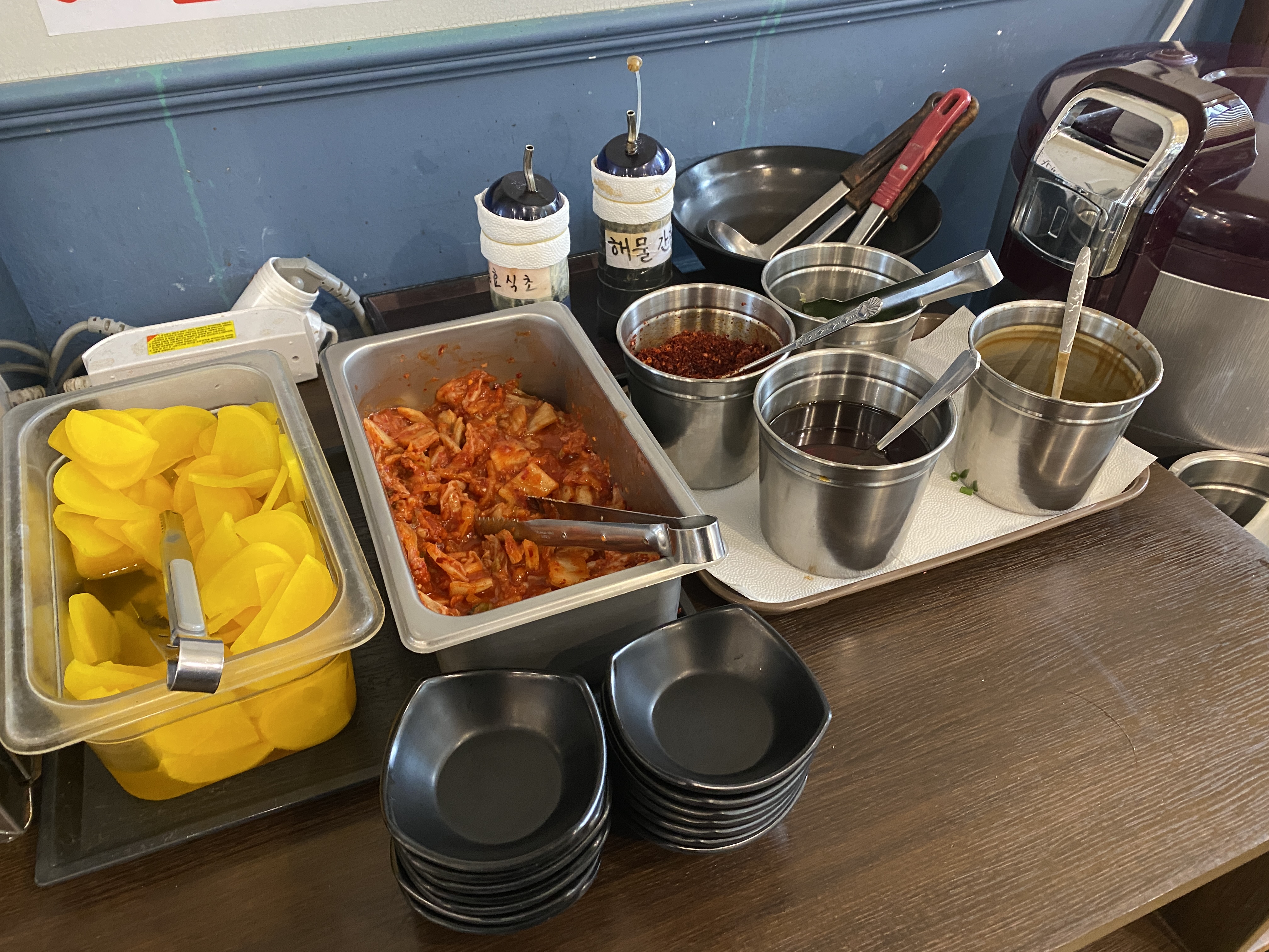 먼저 자리를 맡고, 야채를 담으러 갔습니다.