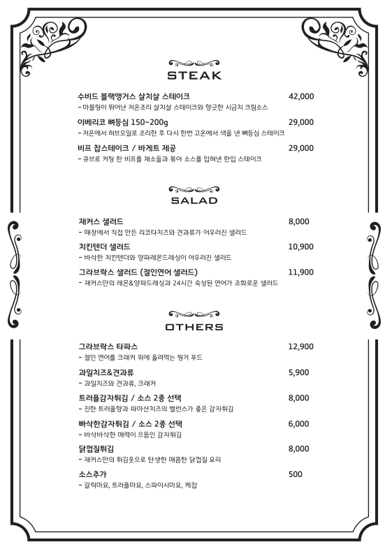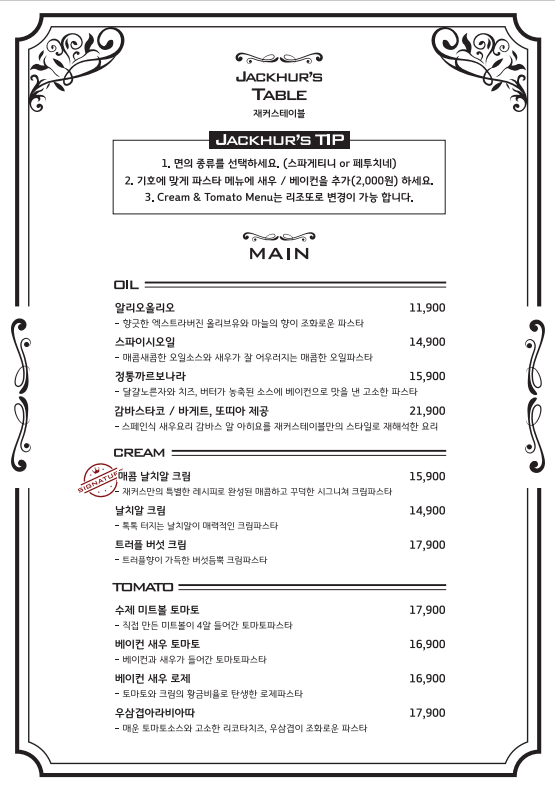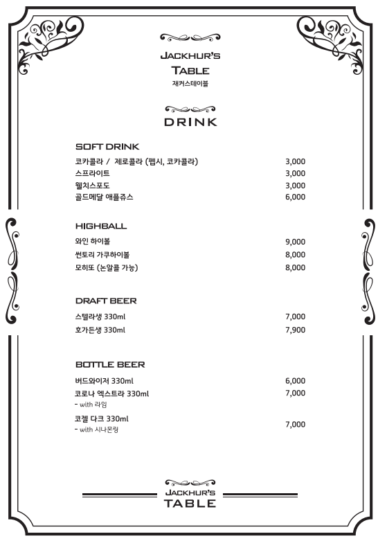 재커스 테이블 메뉴입니다.