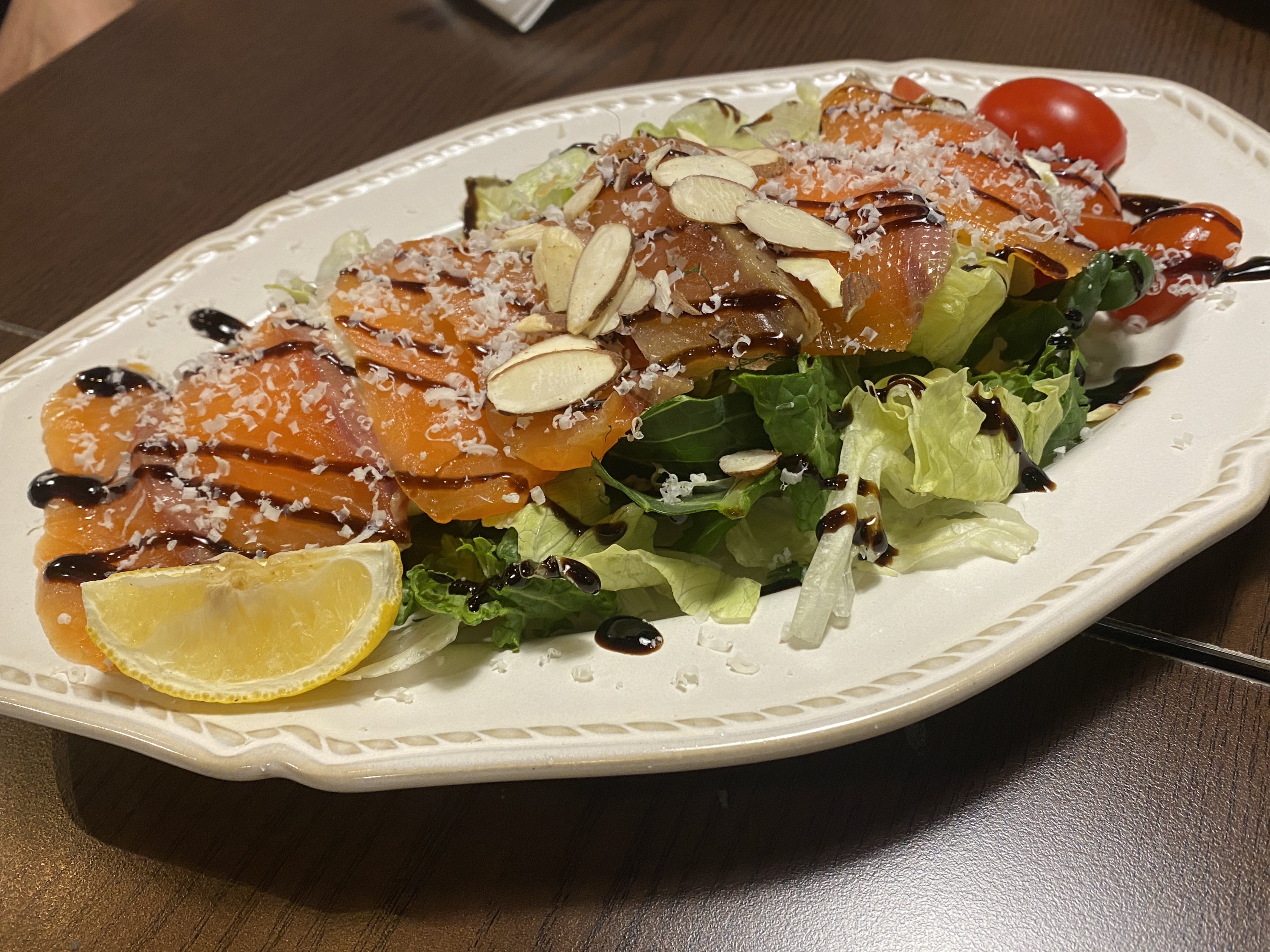 식전빵을 먹고나면, 에피타이저로 주문한 연어샐러드를 먹었어요.