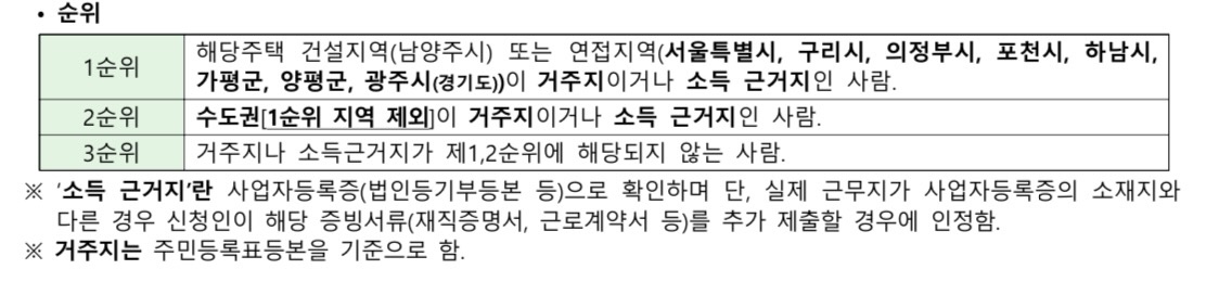 남양주 살거나, 아니면 연접지역에서 소득있으면 1순위이다. 나는 남양주도 살고, 구리에서 일하고 있어서 1순위였다.