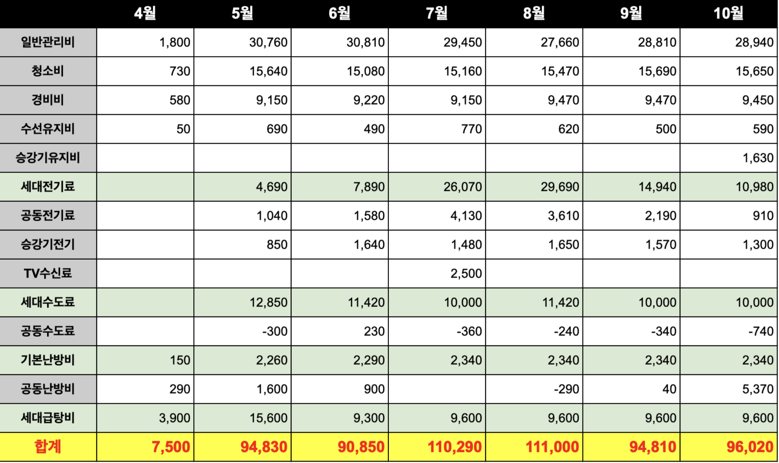 4월은 딱 이틀 지냈기때문에 관리비가 낮습니다. 요건 참고해주시구요.