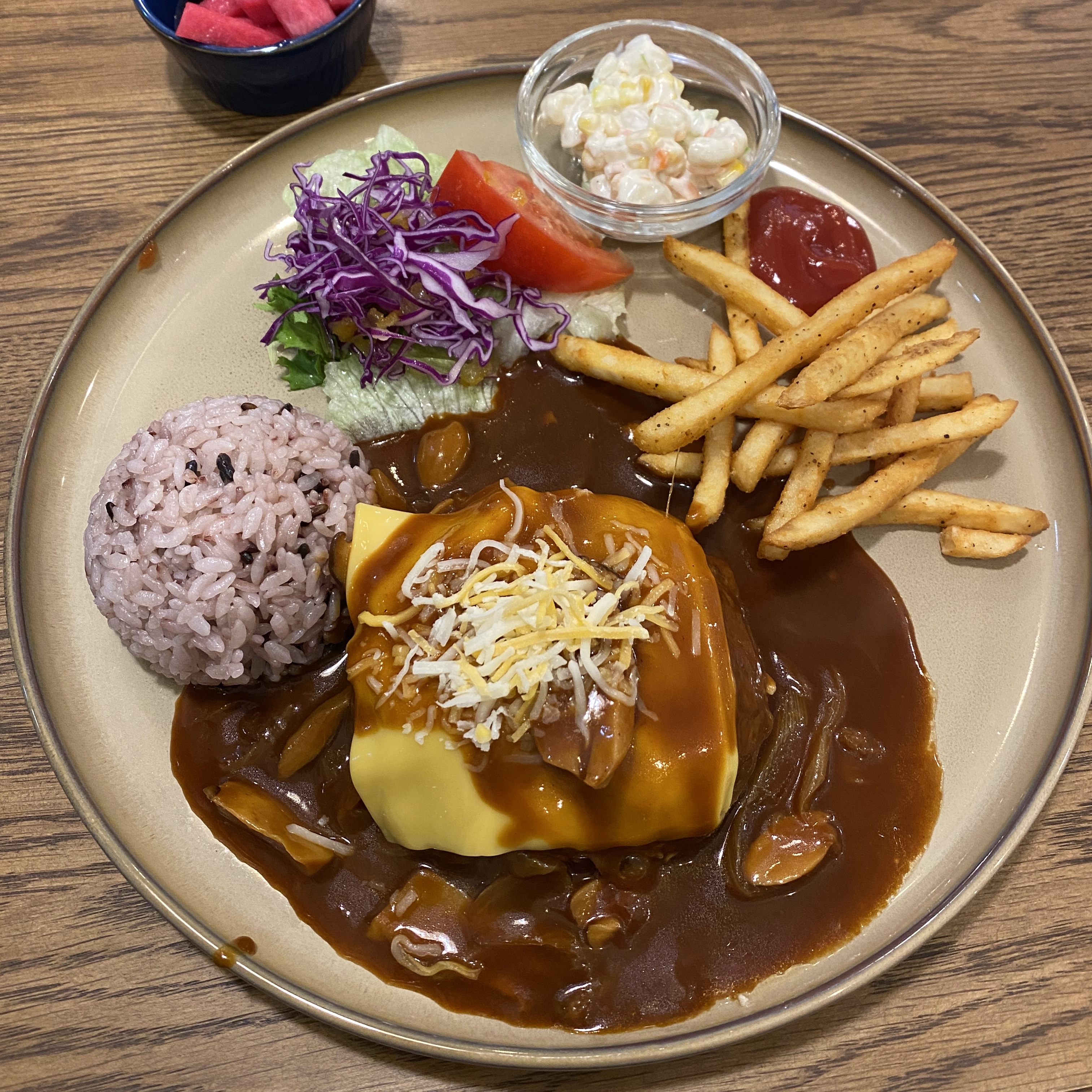 브라운 함박스테이크에 사이드로는 감자튀김을 선택했습니다.