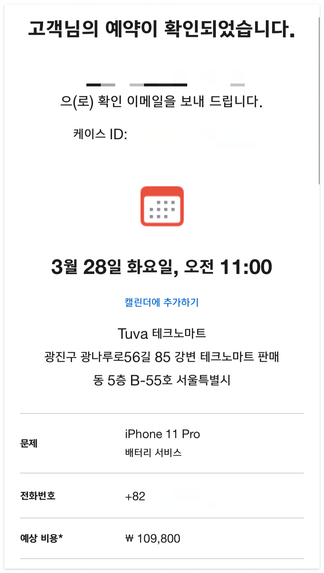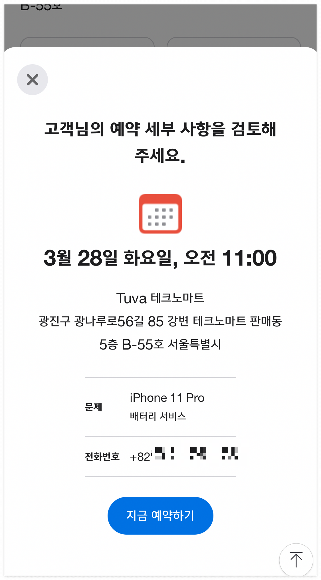 강변 테크노마트에 있는 TUVA 애플 공인 수리업체 에 예약했어요.