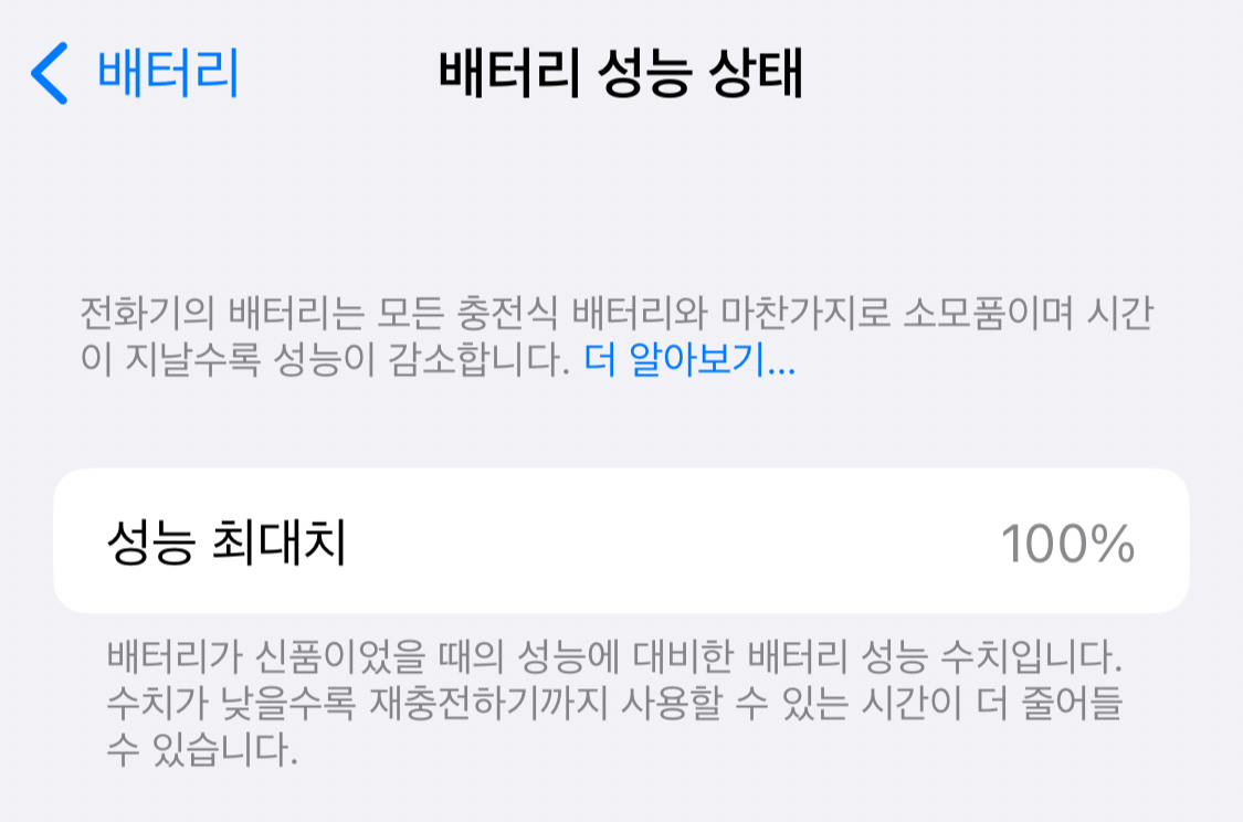 배터리 성능이 70%에서 100%로 변경된 것도 확인했어요.