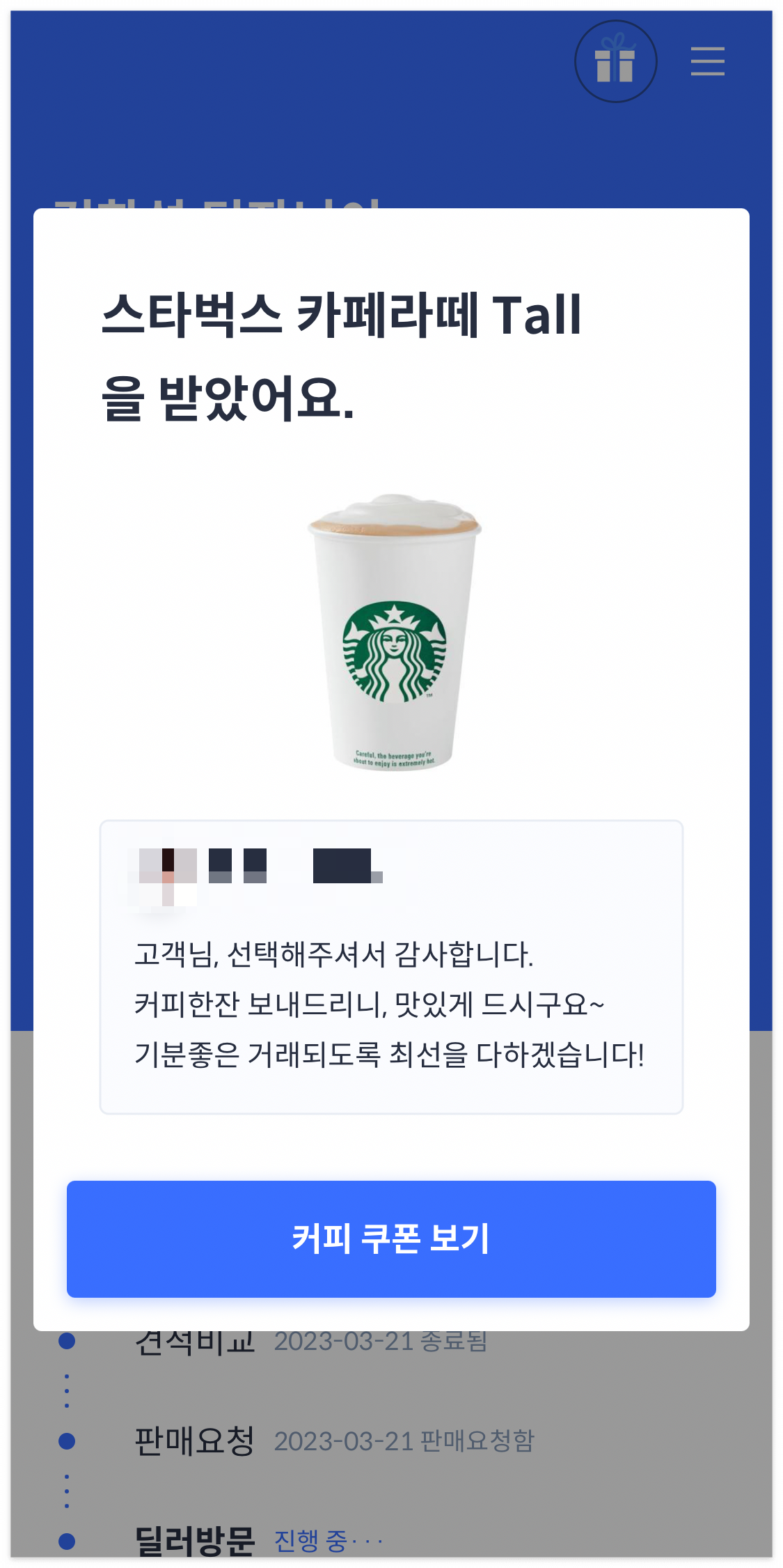 헤이딜러 담당딜러에게서 커피쿠폰도 받았습니다.
