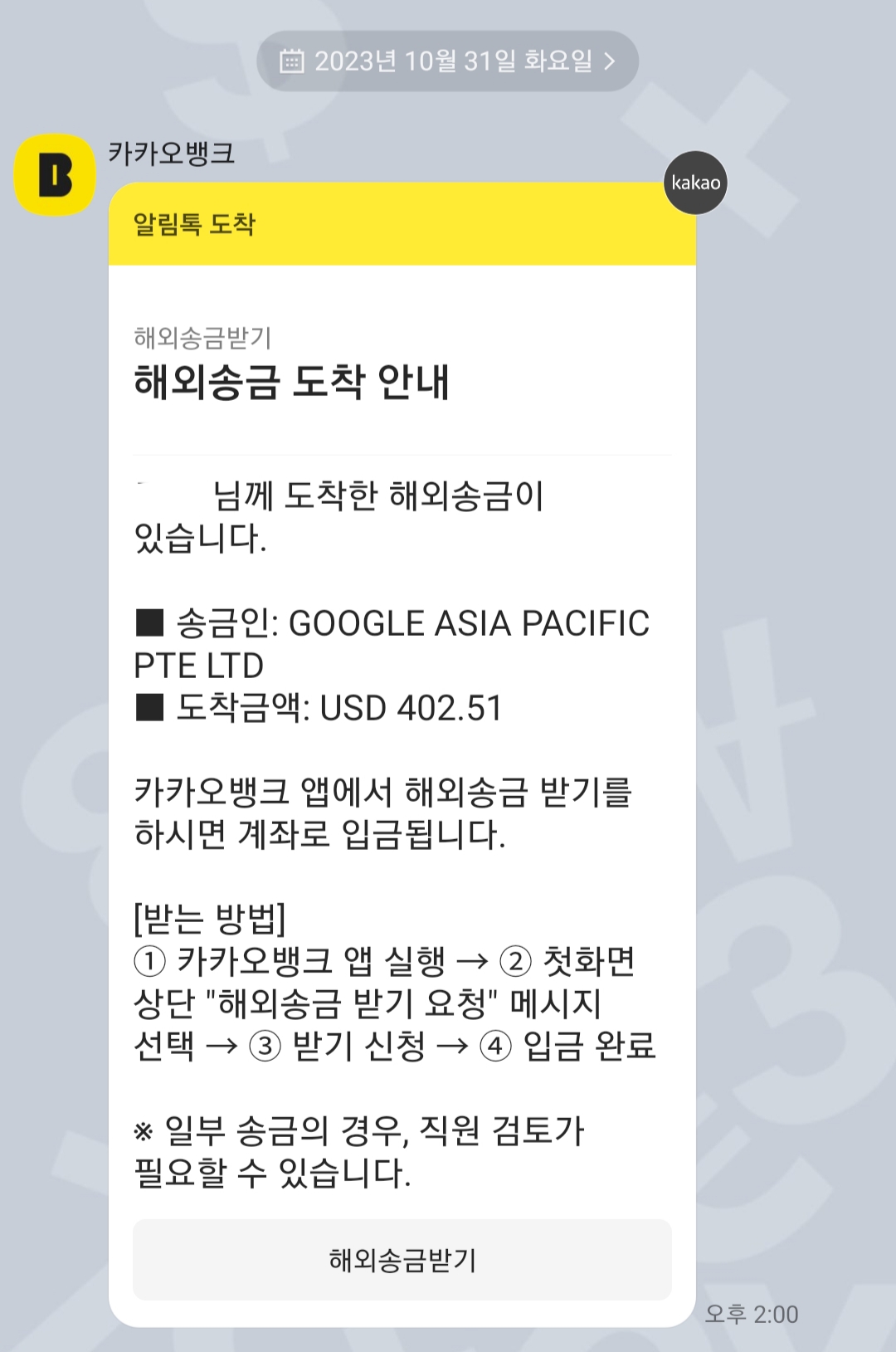 카카오뱅크에서 [해외송금 도착 안내]를 받았어요.