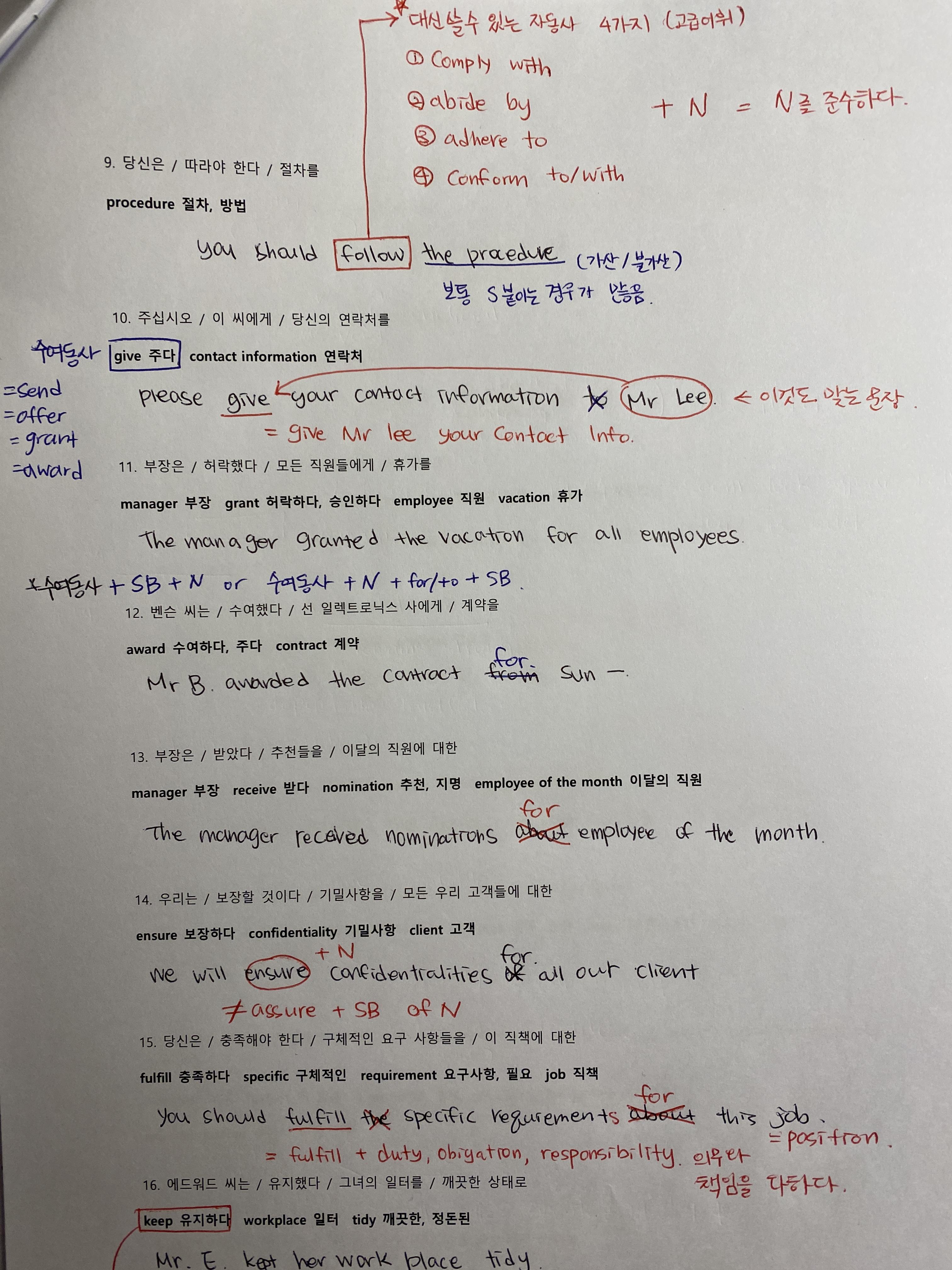 9. You should follow the procedure. * Follow 대신 쓸 수 있는 자동사 4가지 고급어휘: ~을 준수하다. ① comply with +N ② abide by +N ③ adhere to +N ④ comform to/with +N